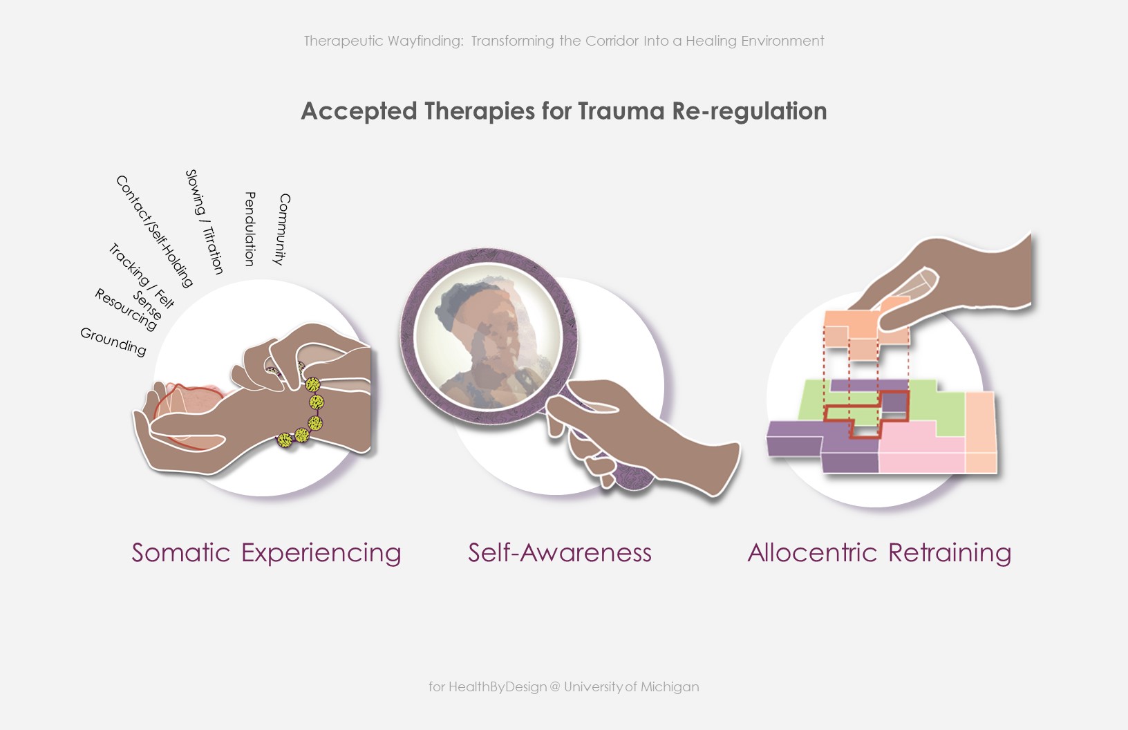 Trauma informed design principles speculate that grounding elements such as identity anchors--achieved through personalization of space and somatic interactions--and contextual maps--achieved through distinct landmarks--can provide the needed opportunities for re-regulation along corridors. We will improve allocentric navigational performance which will provide opportunities for both re-regulation and reduction of intrusive memories. This will also impact the ability for those relying heavily on egocentric wayfinding. Designing corridors that provide context cues as well as places to continuously reregulate will improve willingness of residents to leave room and explore and create a greater sense of residential autonomy. These elements can also be leveraged to improve wayfinding for the benefit of not only trauma-exposed individuals, but the broader population by enhancing allocentric and egocentric cues for route learning ensures safety, choice, and empowerment.