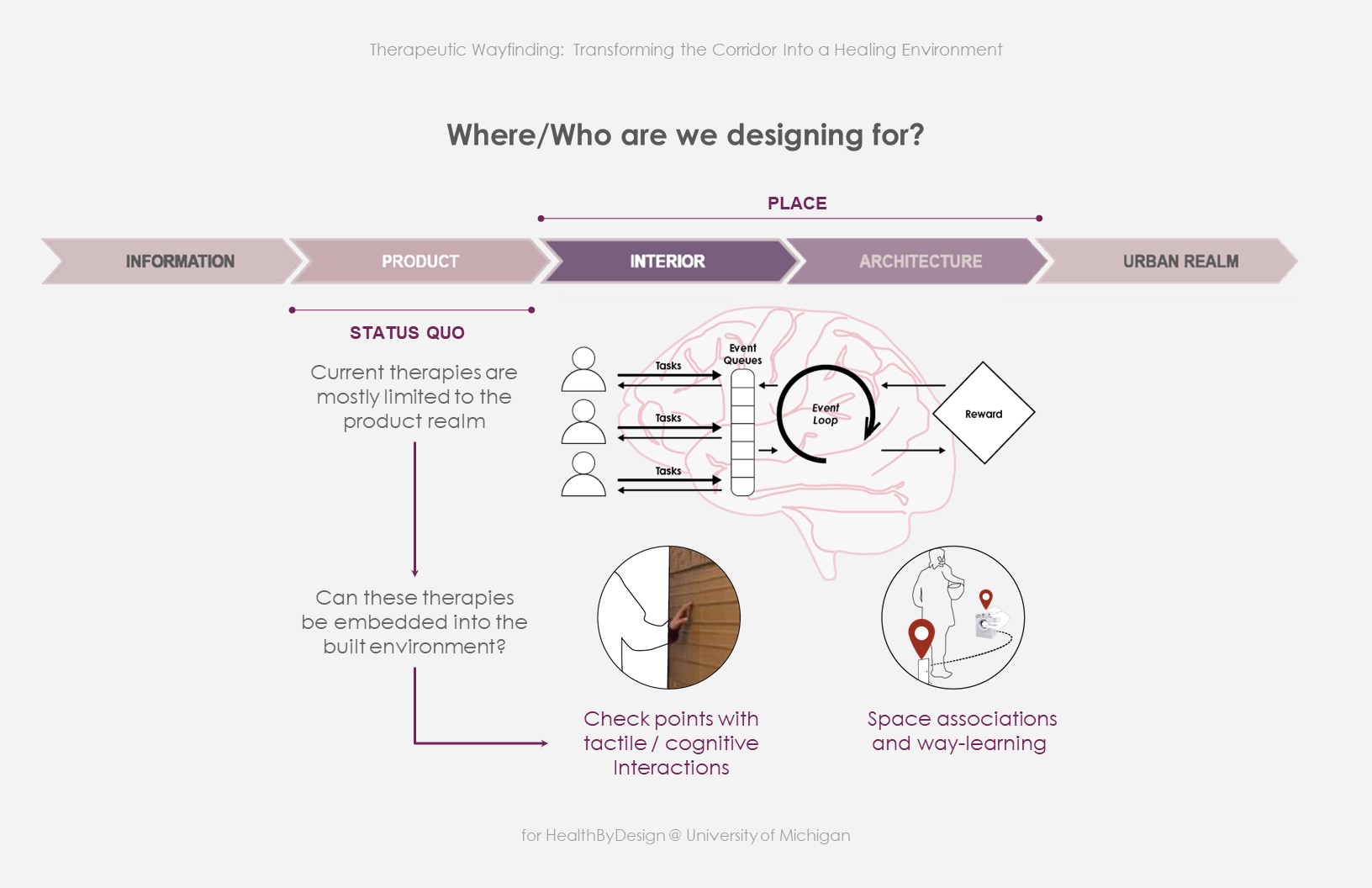 Reliance on egocentric processing increases trauma survivor’s need to rely on sensory cues for wayfinding which then heightens the chances for dysregulation. Experiencing a trigger, due to intrusive cognitive or somatic memory may cause dissociation, flashbacks, and physiological responses. These intrusive memories occur from an inability to ground oneself due to detached sensory stimuli causing disconnection from the present moment and place. Transitional spaces, for instance corridors are particularly triggering due to unfiltered stimuli, lack of identity markers and absence of places or tools for re-regulation. Reregulation and grounding techniques often use sensory cues, sound, touch, sight to connect an individual to the here and now, reassure them of safety and/or detach from emotional pain (Ottoboni, 2013). Therefore, we question how corridors, where dysregulation may occur, can be transformed into a space that provides in its design ways for continuous re-regulation and supports therapeutic wayfinding. Trigger-inducing experiences within the corridor can be inhibitors to autonomous exploration and community participation, and both activities are essential to healthy-aging. By removing stressors from the corridors, as well as building well-designed grounding elements and navigational cues, this project intends to facilitate therapeutic wayfinding and increased autonomy within vulnerable residential communities.