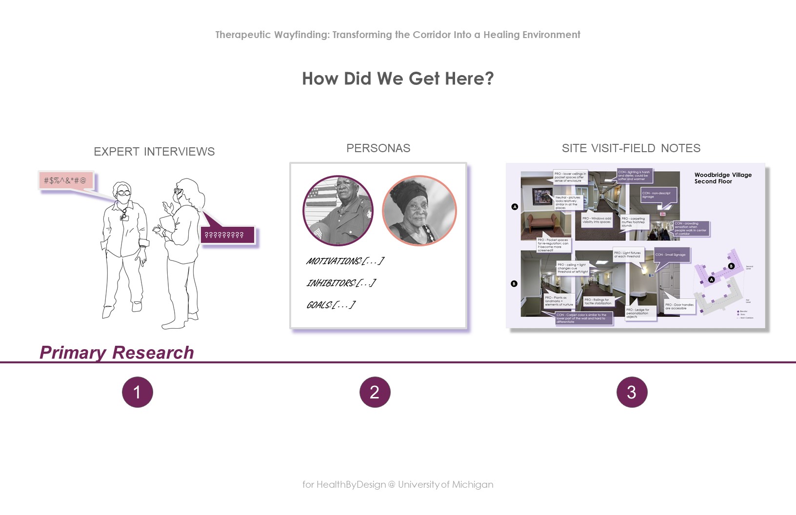 This design challenge was first formulated through field observation at Woodbridge Village. After this occurred we conducted a thorough literature review of cognitive changes, spatial navigation and trauma. We looked at both peer reviewed sources, as well as sources from current practitioners in the design field. Based on several previous case histories, we created two personas with differing trauma histories and differing symptoms (dysregulation and dissociation) who we aimed to design for. In addition we consulted with two professors of Social Work who specialize in trauma informed interventions as well as trauma and cognition.