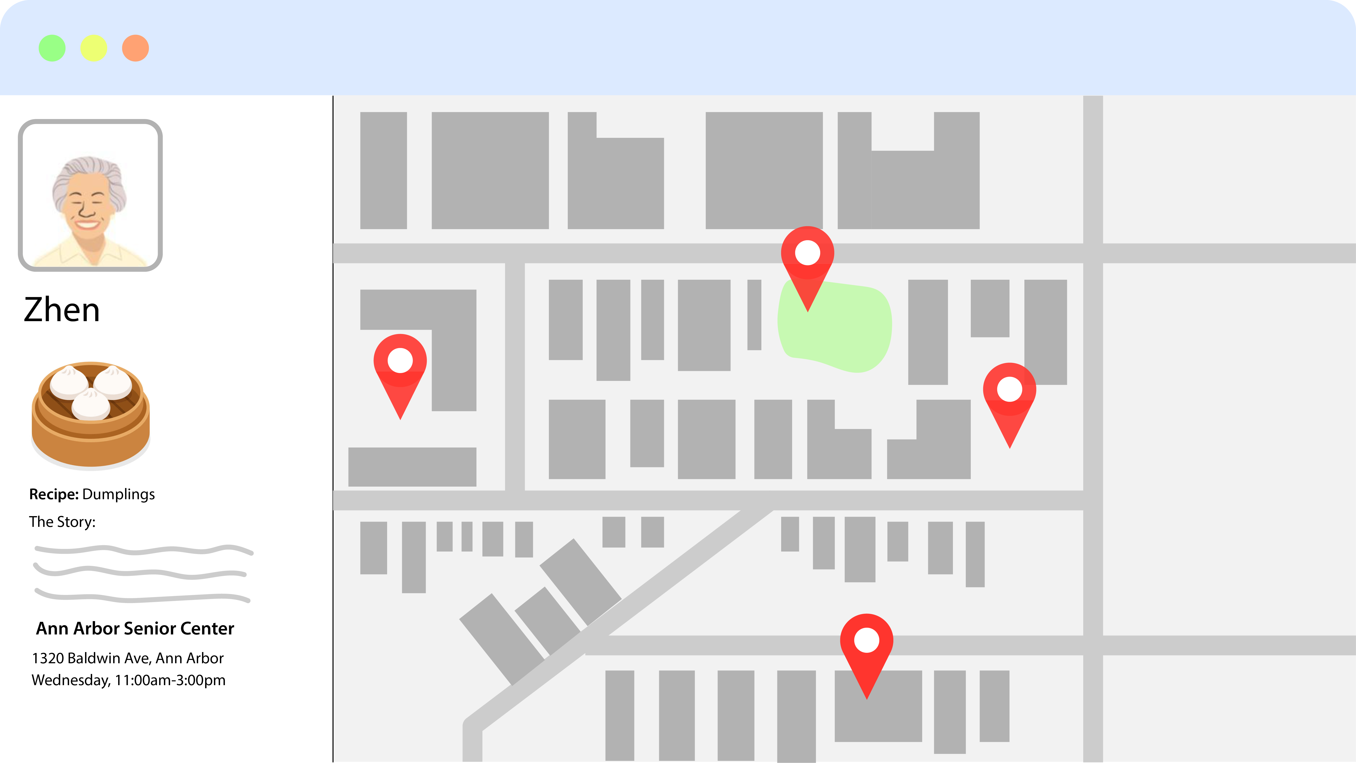 This project was designed through the lens of a senior persona, Grandma Zhen, an 88-year-old woman who has recently immigrated from China. In addition to the difficulties of adjusting to a new place and culture