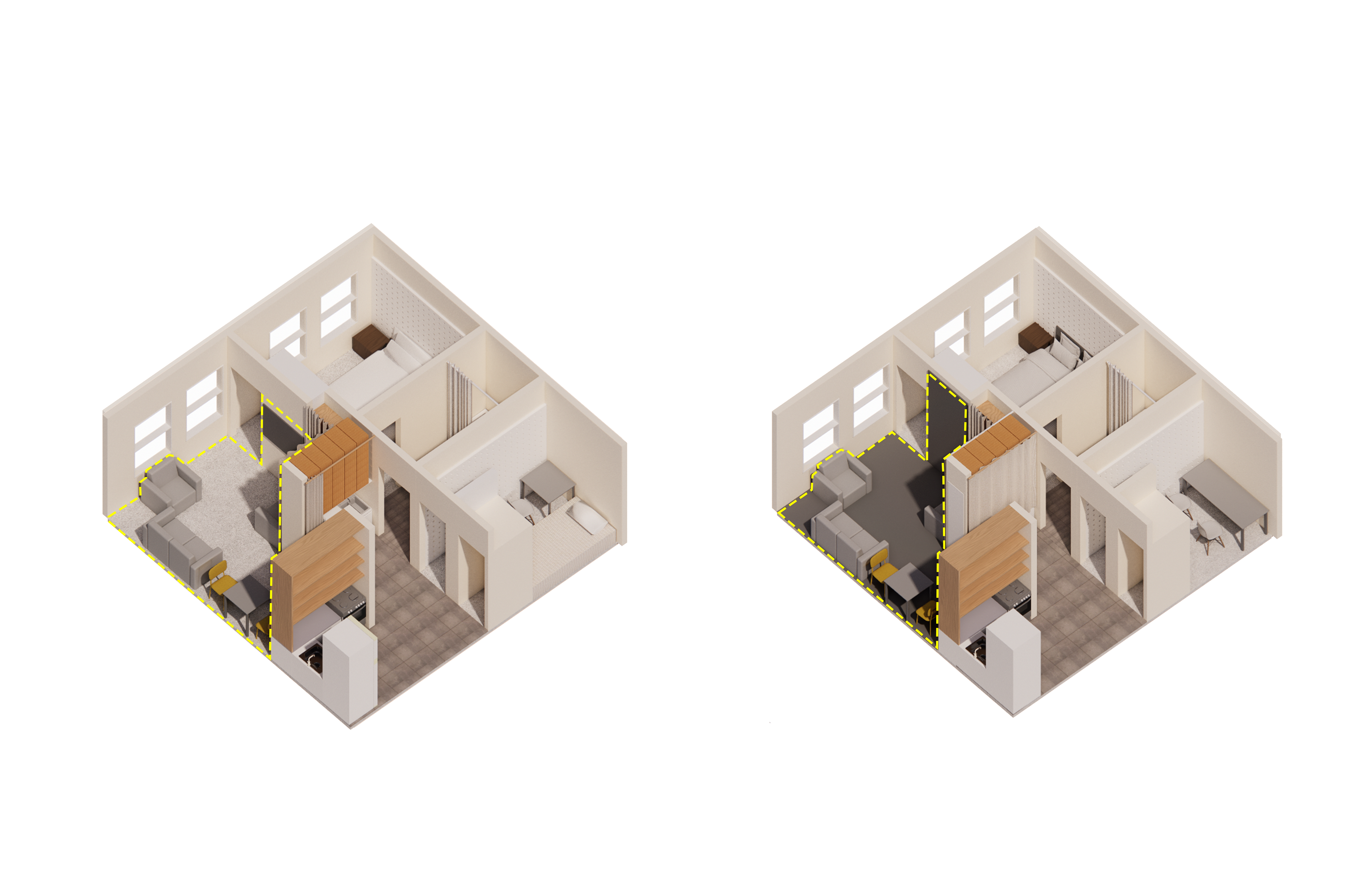 beyond the interior. The second intervention reconfigures the bathroom location and size, reducing excess area and converting the reclaimed space into a dedicated bedroom for his daughter. This adjustment enhances spatial efficiency while better protecting his daughter’s privacy. The third intervention restructures the kitchen layout. While increasing storage capacity, we also expanded the entrance zone as much as possible, allowing Sean more room to organize and manage his supply boxes.