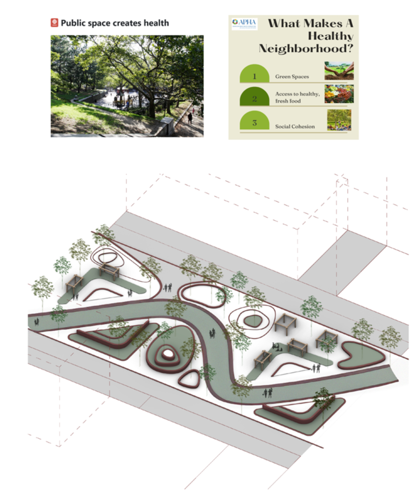 By reimagining suburban public space as a community health hub, the design transforms daily routines into opportunities for wellbeing. Healthy food kiosks, shaded walking paths, play areas, and family-friendly programs make diet and mobility social, accessible, and enjoyable. This project proposes integrated community nodes—plazas, parks, and weekly markets—that combine affordable, culturally sensitive healthy food with activity-friendly design. By placing healthpromoting choices at points of decision and embedding them in the daily rhythm of suburban life, these spaces make it easier for Sean and families like his to eat well, stay active, and connect with neighbors. [Food stalls organized along park entrances (like at Sanjay Gandhi National Park, Mumbai), so the point of entry =point of decision** for healthier snacking.] The intervention not only improves individual health outcomes but also fosters collective resilience, creates economic opportunities and cultivates a suburban environment where wellbeing is part of everyday life.