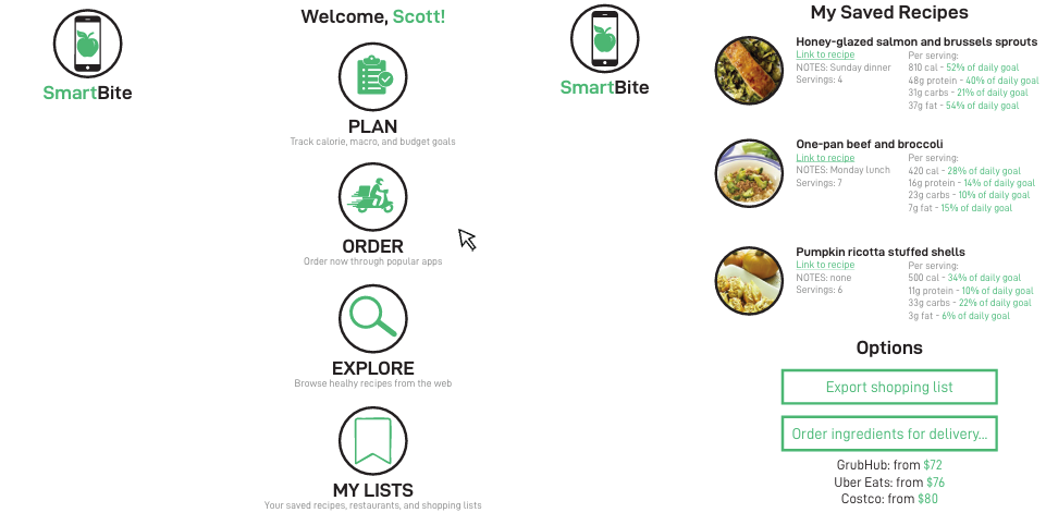 This custom plan is used for several SmartBite functions. The user can search for meals through popular delivery services that f it their plan and goals. This can also work the opposite way- SmartBite will offer a pop-up at checkout of any connected delivery service, notifying the user of the nutrition facts of their order, and how it fits into their plan. SmartBite can also search the web and save recipes to cook at home and generate a shopping list based on the user’s selected meals. This shopping list can then be sent to popular grocery delivery services, or exported for personal use.