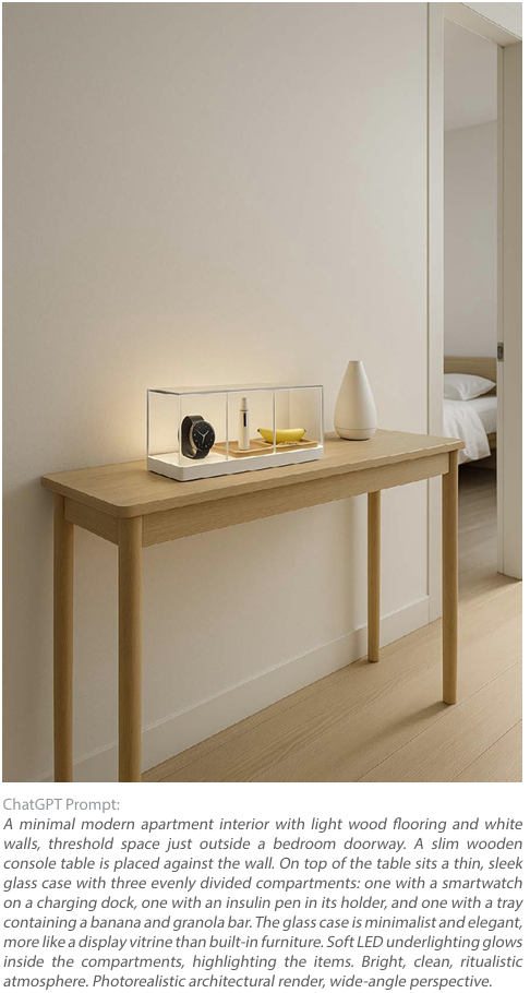 By embedding Austin’s devices, insulin, and food into a single architectural threshold, this intervention reframes health management as a spatially bound ritual rather than a dispersed, effortful routine. The Integrated Console reduces friction, aligns decision points, and transforms everyday passage into a moment of embodied care — producing consistent health outcomes while honoring autonomy and routine.