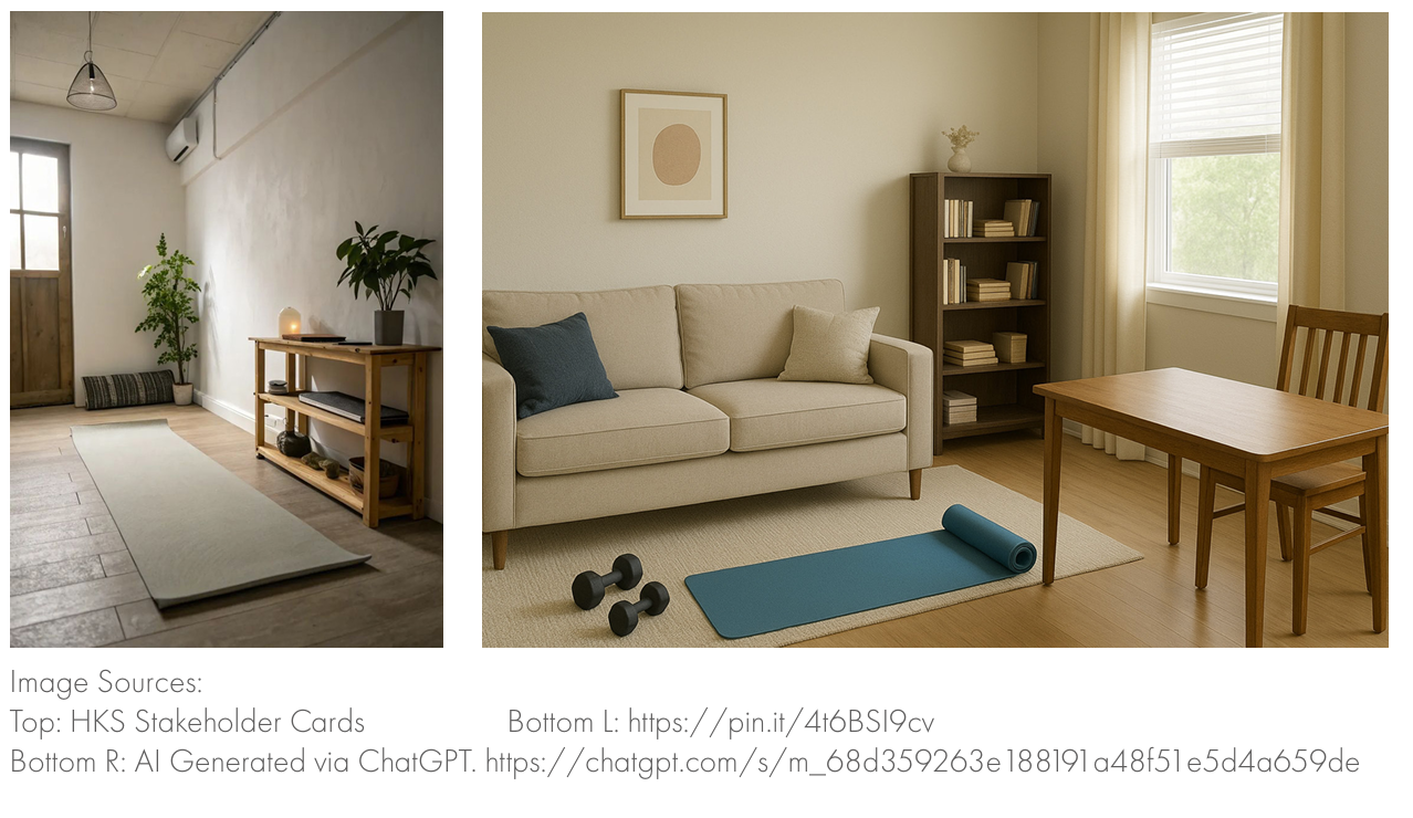Design interventions that transform existing spaces help create psychological boundaries between caregiving duties and self-care activities. This helps reduce cognitive load for the carer and increases the likelihood of engaging in self-care activities, maintaining good health for all.