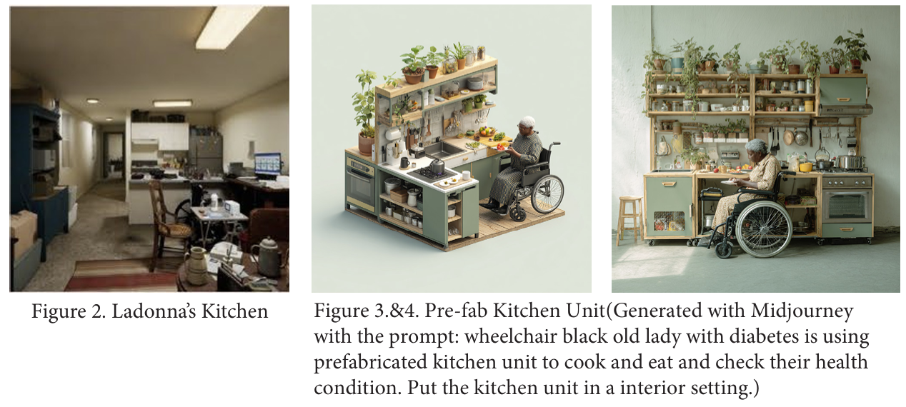 For many people with diabetes and mobility challenges, like our persona Ladonna, the kitchen, which suppose to be a space for nourishment, can become a source of stress and limitation. Standard kitchens implemented in apartments often fail to accommodate physical accessibility needs, and daily health management can feel disconnected from everyday routines. Our project addresses this gap by designing a prefabricated, multipurpose kitchen kit-and-part units that seamlessly integrates accessibility, health monitoring, and joyful cooking experiences.